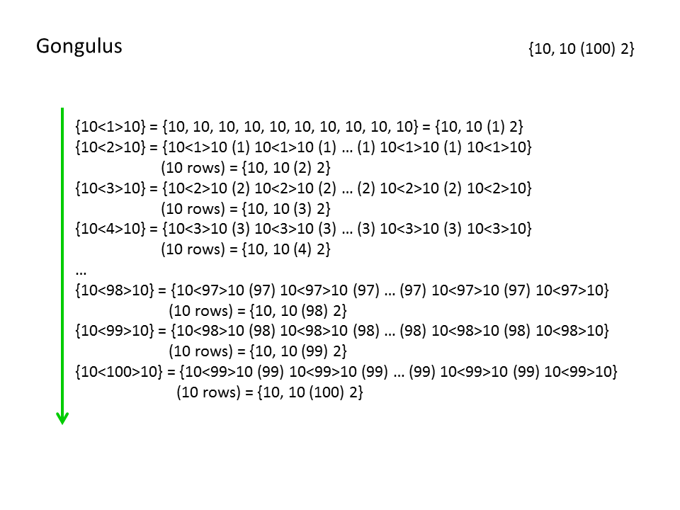 Гонгулус (англ. Gongulus) равен в BEAF.[1] Он эквивалентен решению центроакта (100-мерного гиперкуба) из 10 с длиной стороны 10, и, таким образом, он может быть записан как с использованием оператора массива. В нём 10 повторяется гаргугол раз. Термин был введён Джонатаном Бауэрсом.