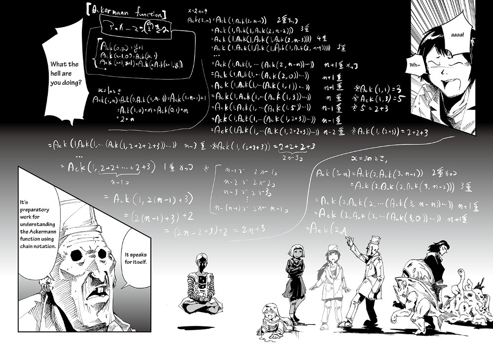 A page from Sushi Kokuu Hen demonstrating the Ackermann function.