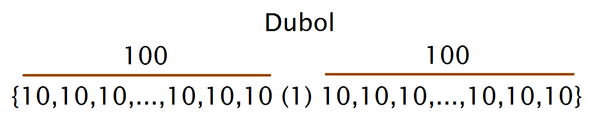 Dubol is equal to {10,100 (1)(1) 2} = {10,10,10,...(100 10's)...10,10,10(1)10,10,10,...(100 10's)...10,10,10} in BEAF.[1] The term was coined by Jonathan Bowers. It is comparable to Saibian's deutero-godgahlah.