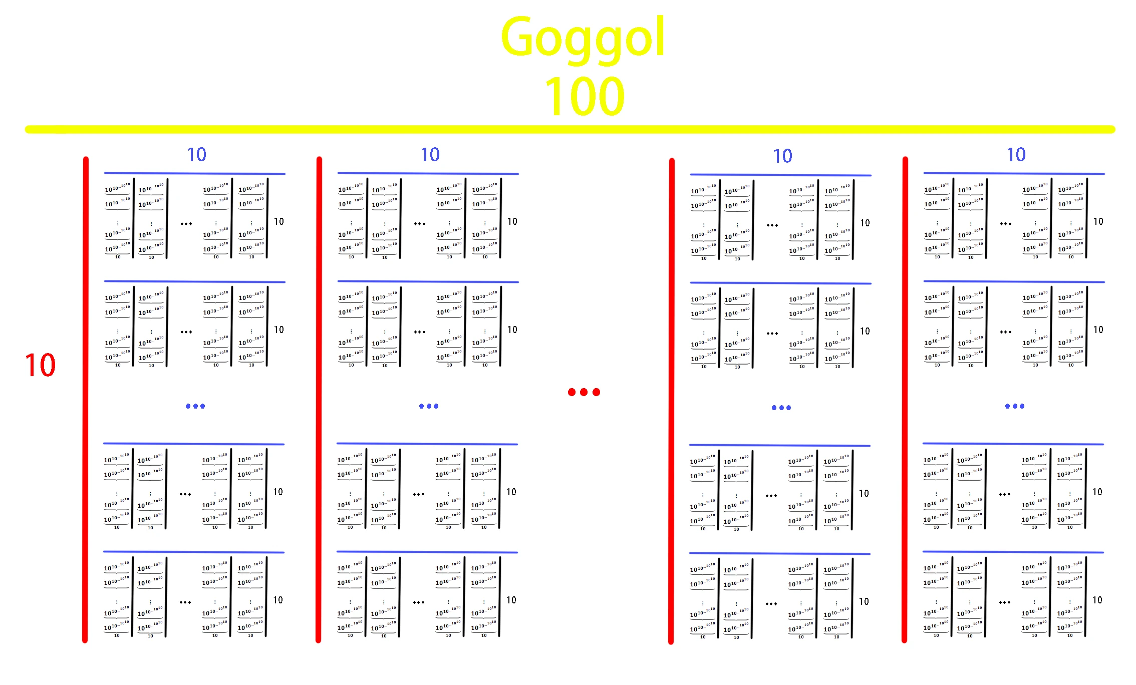 Goggol is equal to \(\{10,100,6\}\) in BEAF, or 10 octated to 100.[1] The term was coined by Jonathan Bowers by altering the vowel sound in "googol."