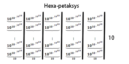 The hexa-petaxis (formerly hexa-petaksys) is equal to E1#1#1#6 in Hyper-E Notation.[1] The term was coined by Sbiis Saibian. In up-arrow notation, this number is equal to \(10\uparrow\uparrow\uparrow\uparrow 6\).