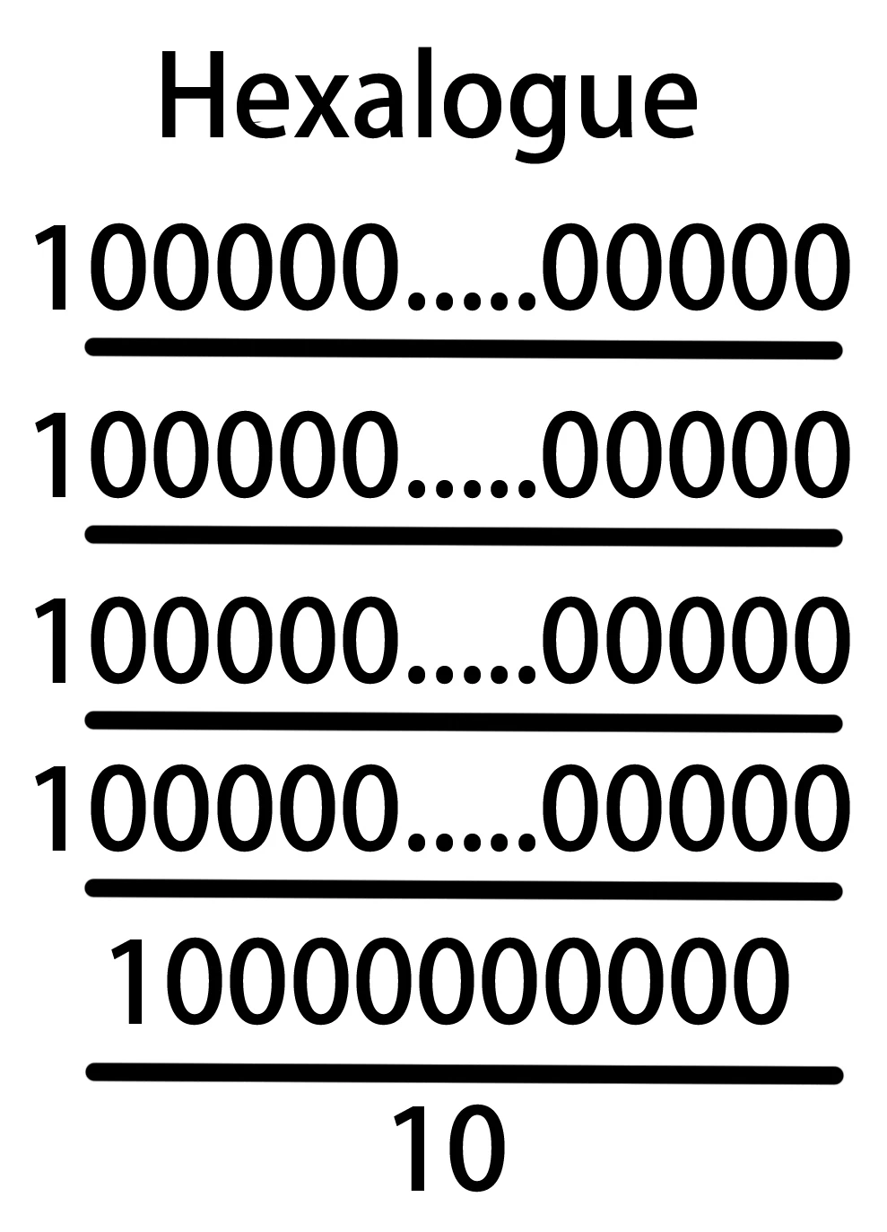 Hexalogue is equal to E1#6 = EEEEEE1 = 10^10^10^10^10^10 = 101010101010, using Hyper-E Notation.[1][2] The term was coined by Sbiis Saibian.