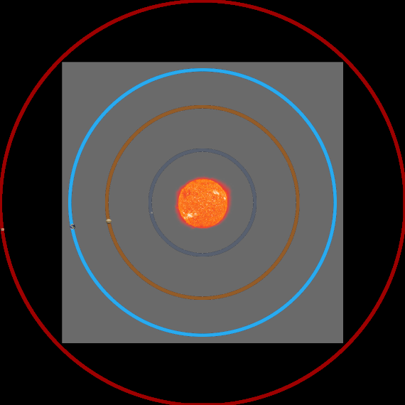 A square of 1027 square centimeters in area compared to the average orbital distances of the inner planets. The sun is drawn at a scale about 50x larger and the planets at a scale about 500x larger than the remainder of the diagram.