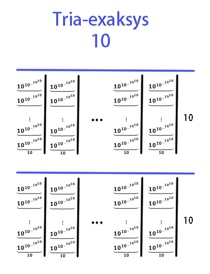 Tria-exaxis (formerly tria-exaksys) is equal to E1#1#1#1#3 in Hyper-E notation.[1] The term was coined by Sbiis Saibian. In up-arrow notation, this number is equal to \(10\uparrow^{5} 3\).
