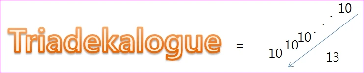 The triadekalogue is equal to E1#13, using Hyper-E Notation.[1][2] The term was coined by Sbiis Saibian. In up-arrow notation, it can be written \(10 \uparrow\uparrow 13\).