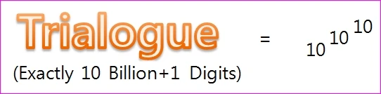 Trialogue is equal to E1#3 = EEE1 = , using Hyper-E notation.[1][2] The term was coined by Sbiis Saibian. It is also equal to 1010,000,000,000, or 1 followed by dialogue (10 billion) zeroes. This number is also equal to 310, or 10↑↑3 using arrow notation. It is also called ten trimillitrestrigintatrecenmillitrestrigintatrecenmilliduotrigintatrecentillion in the short scale. It is 10,000,000,001 digits long.